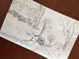Baby girl fell asleep in her car seat, and rather than wake her, I waited with her in the cold for 45 minutes. I didn't have a sketch pad, cell phone, or book so I had to improvise with some scrap paper.